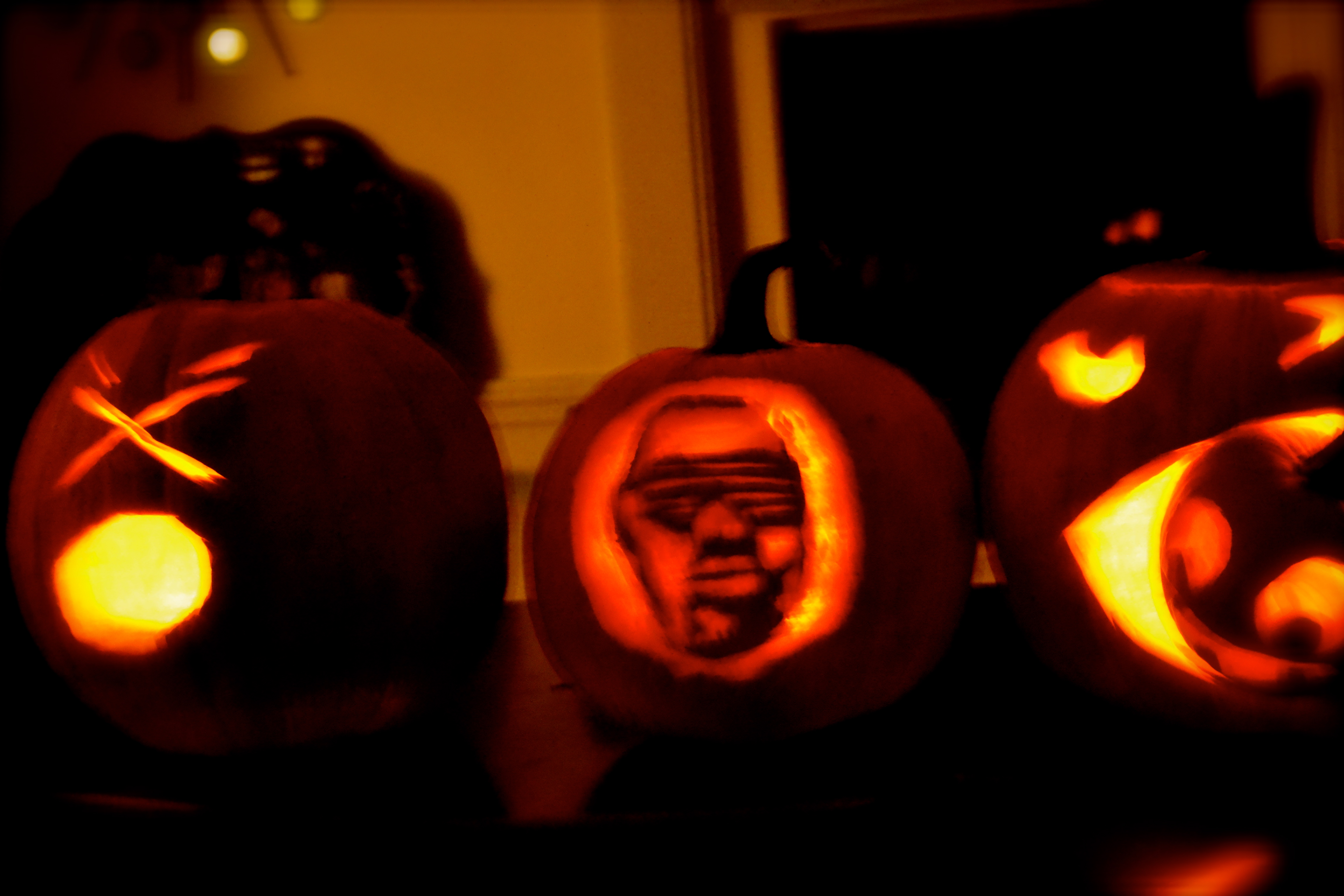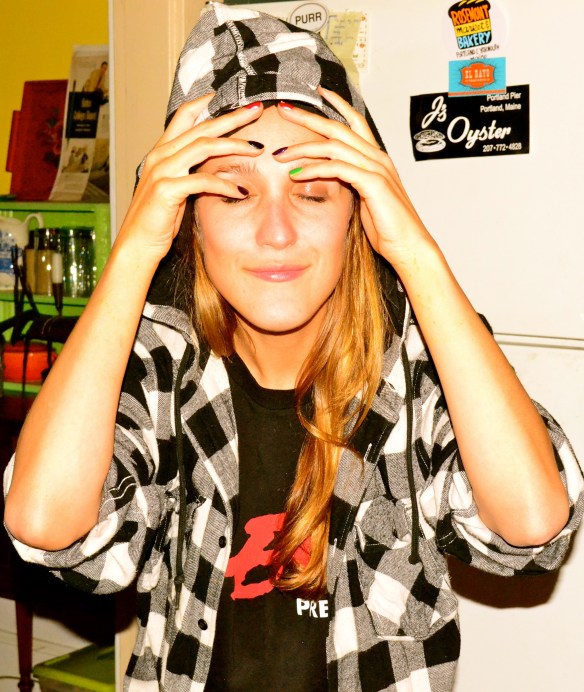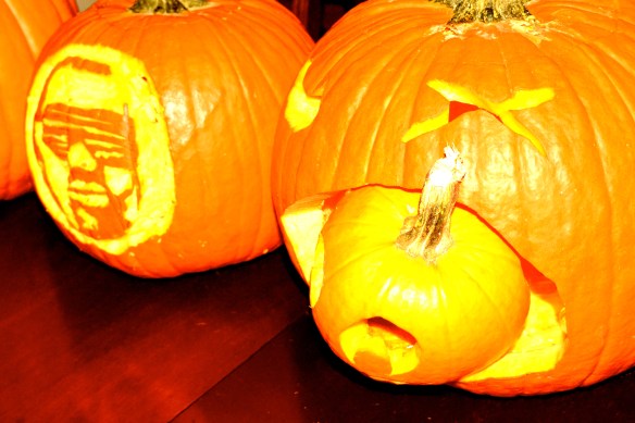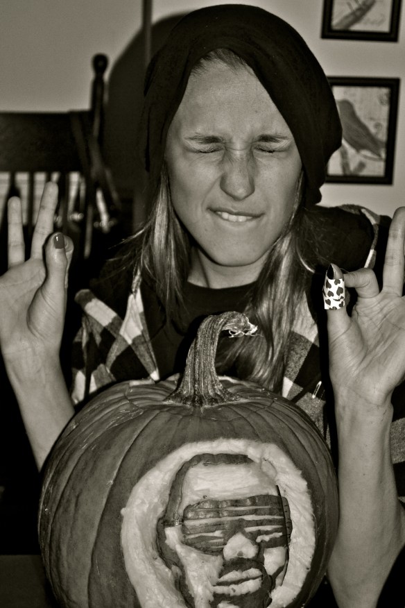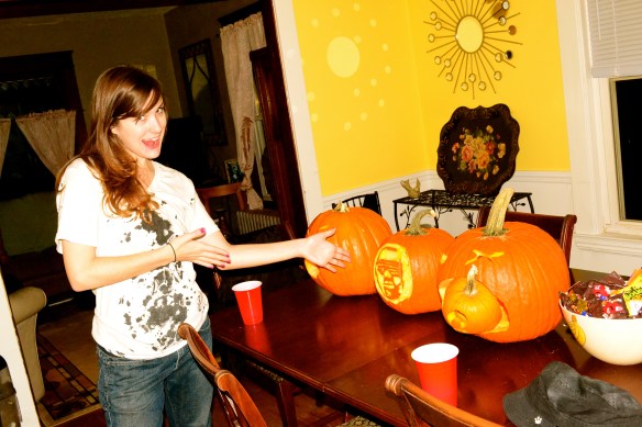 Last night, Miek, Erik and my birthday girl sister, Cecelia had an epic night of carving pumpkins, dancing to Thriller, eating Totinos pizza rolls and boneless buffalo wings and too much Halloween candy. Our costume theme was “Dress As Your Significant Other.” Unfortunately, I have few photos of the guys in their sparkles and leopard, but here are a few highlights of the evening (including a shot of Miek’s fabulous “smoky eyes”)…
